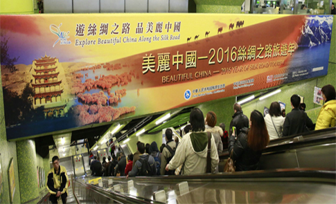 1月26日,一幅長14.5米、高2.5米,面積達36平方米,以“美麗中國—2016絲綢之路旅游年”為主題的大型廣告在香港灣仔地鐵站閃亮登場。大漠、駝隊、雪山、海洋等元素配以黃沙和藍海底色,組合成一幅絲路風景的寫意圖畫,形成了強大的視覺沖擊力,吸引了過往乘客拍照留念。